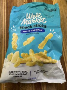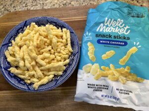 However, I think I found almost my perfect snack for playing Euchre. And I found it at my nearby CVS. A company called Well Market manufactures White Cheddar Snack Sticks. I call the Cheddar Crunchies, reminiscent of Cheetos, minus the orange dust all over one’s fingers and just as addictive. The Bag states in bold letters that the crunchies are made with REAL WHITE CHEDDAR CHEESE and hasno artificial ingredients. Even more wonderful, they are Gluten Free, if you need. My 7-ounce bag cost $3.99.
