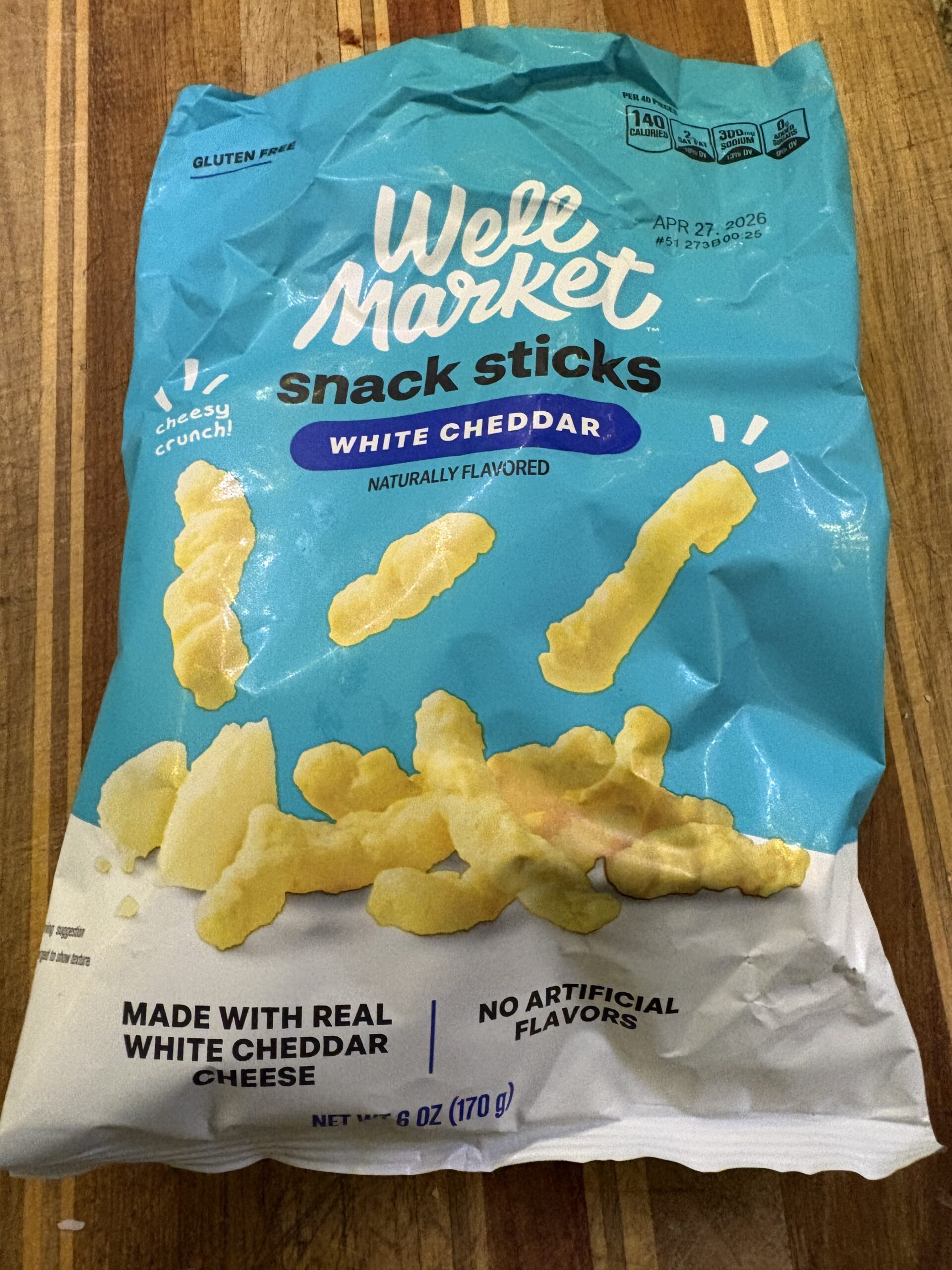 However, I think I found almost my perfect snack for playing Euchre. And I found it at my nearby CVS. A company called Well Market manufactures White Cheddar Snack Sticks. I call the Cheddar Crunchies, reminiscent of Cheetos, minus the orange dust all over one’s fingers and just as addictive. The Bag states in bold letters that the crunchies are made with REAL WHITE CHEDDAR CHEESE and hasno artificial ingredients. Even more wonderful, they are Gluten Free, if you need. My 7-ounce bag cost $3.99.