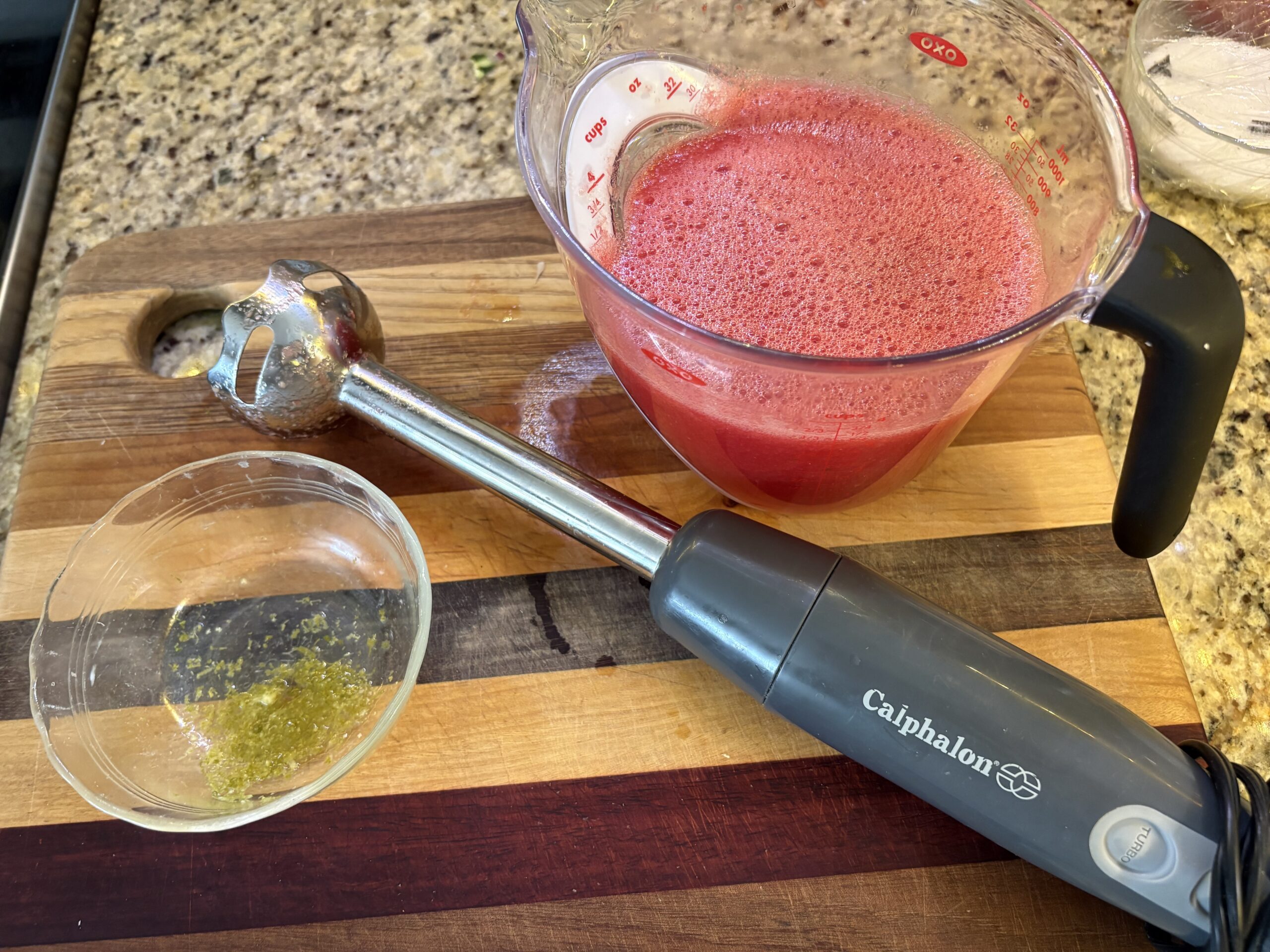 Those 3 main ingredients are watermelon, a fresh lime and fresh ginger. Salt is always a must with watermelon. And a stick blender helps a lot.